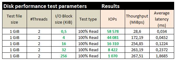 - IOPS : Abréviation de « Input / Output operations per second », il s’agit du nombre de transaction en lecture ou écriture possible en 1 seconde. Une transaction correspond à l’écriture ou la lecture d’un bloc de données (I/O block size). Donc si l’application manipule des blocs de grande taille (par exemple 256 KiB), la valeur des IOPs sera forcément plus faible qu’avec des blocs de petite taille (4 KiB par exemple).