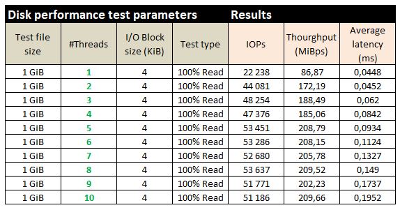 On constate très clairement un gain de performance entre 1 et 2 threads, puis la performance augmente moins rapidement pour plafonner vers 50K IOPs et 200 MiBps au delà de 4 threads