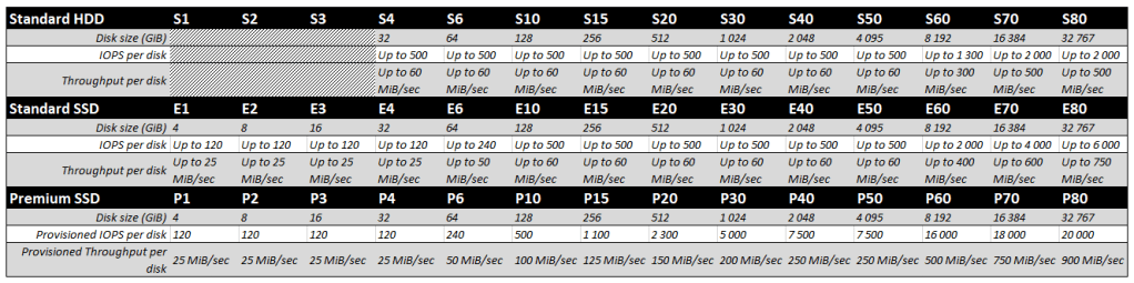 Pour les gammes Standard et Premium, Microsoft propose plusieurs tailles (en GiB) de disque. La taille du disque détermine le niveau de performance associé.